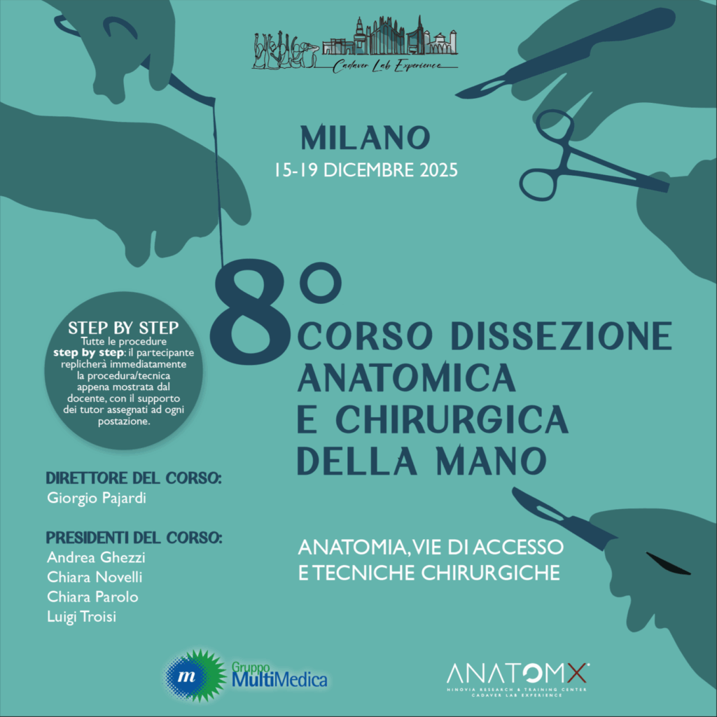 Ho il piacere di presentare la Ottava Edizione del Corso di Dissezione Anatomica e Chirurgica della Mano: anatomia, vie di accesso e tecniche microchirurgiche che si terrà a Milano dal 15 al 19 Dicembre 2025. La didattica su preparati anatomici rappresenta una pietra miliare nella preparazione sia dei giovani specializzandi che dei chirurghi già maturi: poter congiungere la didattica frontale tradizionale con la dissezione anatomica ed il successivo riscontro in sala operatoria di quanto appreso è senza dubbio una modalità di insegnamento 2.0. Questa settimana in particolare è dedicata agli Specializzandi e Specialisti di Chirurgia Plastica, Estetica e Ricostruttiva e di Ortopedia e Traumatologia che vogliano cimentarsi nel meraviglioso mondo della Chirurgia della Mano, approfondire l’anatomia dell’arto superiore e migliorare le loro conoscenze e le loro tecniche operatorie. È l’evoluzione e la sintesi del corso di dissezione che ebbi l’onore di creare durante la mia presidenza della SICM nel 2011 ad Arezzo, che ha formato centinaia di giovani.